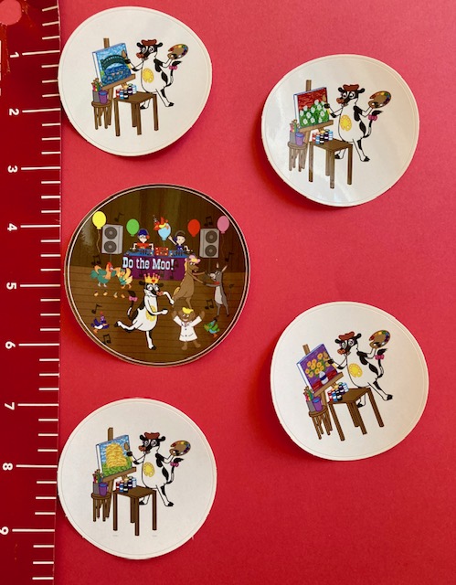 The 2.5” round set includes all four stickers in the Moo-Nay collection of her painting: The Bridge, The Haystacks, The Sunflowers, The Daisies and a collection bonus large 3” round sticker of the “Do the Moo!” Art party!